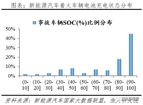 據(jù)新能源汽車國家大數(shù)據(jù)聯(lián)盟披露,從2019年5月1日至2019年底,國家平臺(tái)監(jiān)測和統(tǒng)計(jì)的新能源車輛事故共計(jì)113起。其中在著火事故車輛中,處于充電狀態(tài)、充滿電后靜置狀態(tài),最容易發(fā)生著火事故,分別占比38%和24%。另外,新能源汽車著火事故大多發(fā)生在高SOC狀態(tài);SOC在90%以上的事故占比達(dá)到45%,SOC在95%以上占比29%。