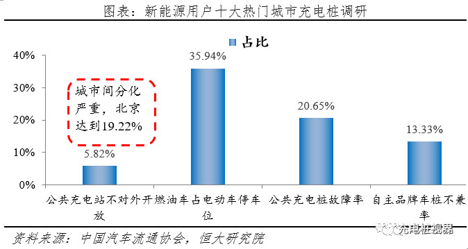 2019年8月,中國汽車流通協(xié)會(huì)發(fā)布的《2019新能源汽車消費(fèi)市場研究報(bào)告》披露:針對新能源用戶十大熱門城市(北京、上海、深圳等)公共充電樁調(diào)查顯示,主要有四類問題導(dǎo)致部分公共充電樁不能用:1)5.82%的公共充電樁不對外開放,且各城市分化嚴(yán)重,北京這一比例高達(dá)19.22%;2)35.94%的公共充電樁停車位被燃油車占領(lǐng);3)20.65%的公共充電樁發(fā)生故障;4)13.33%的自主品牌充電樁相互不兼容。