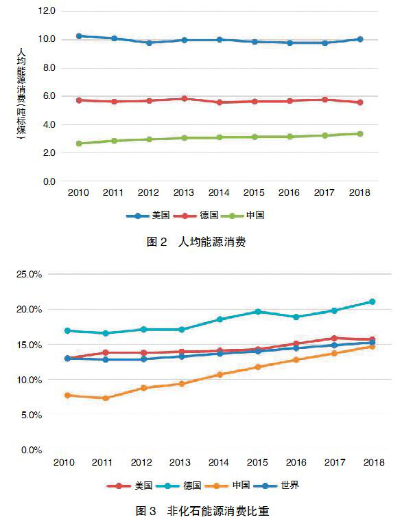 一是我國能源消費(fèi)增量遠(yuǎn)高于其他國家。從圖1可以看出,2010-2018年,我國能源消費(fèi)總量從35.6億噸標(biāo)煤增至46.8億噸標(biāo)煤,增長幅度31.4%。美國能源消費(fèi)總量從31.8億噸標(biāo)煤增至32.9億噸標(biāo)煤,增長了3.5%。德國能源消費(fèi)總量從4.7億噸標(biāo)煤降至4.6億噸標(biāo)煤,降幅為1.2%。