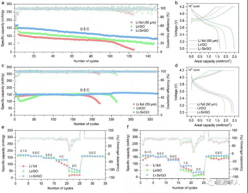 進一步在全電池測試中證實了電化學性能的提高。分別使用Li箔、Li-rGO和Li-SirGO(~10mAh cm-2)與NMC532正極(~2.5mAh cm-2)組裝全電池,同時在60 μl的1 M LiPF6/EC-DEC-FEC-VC和1 M LiFSI/DME-TFEO的電解液中均能顯示出循環(huán)性能的大幅度提高。這些復合鋰金屬負極不僅可以進一步增強可充能力,還進一步降低了循環(huán)中的過電位。