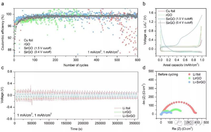 為了證明Si納米顆粒的嵌入對rGO的電化學性能的影響,通過組裝半電池在1 mA cm-2,1 mAh cm-2的條件下測試CE。相比之下,同樣使用1 M LiFSI/DME-TFEO作為電解液的SirGO能夠表現(xiàn)出更高且穩(wěn)定的CE,更加值得注意的是,當剝離電壓為1.5V時,SirGO變現(xiàn)出的CE具有更大的波動,這主要是歸因于一些LixSi顆粒與骨架沒有完全的電子接觸,導致需要有一次的激活過程;以及高截止電壓導致LixSi中的Li被脫出,使得電極結構不能被很好保持。因此,將每次循環(huán)的截止電壓設置為0.4V,使得LixSi中的Li不被脫出,進而提高CE的穩(wěn)定性。此外,進一步測試了對稱電池和阻抗,相比未修飾之前,性能均得到大幅度提升。