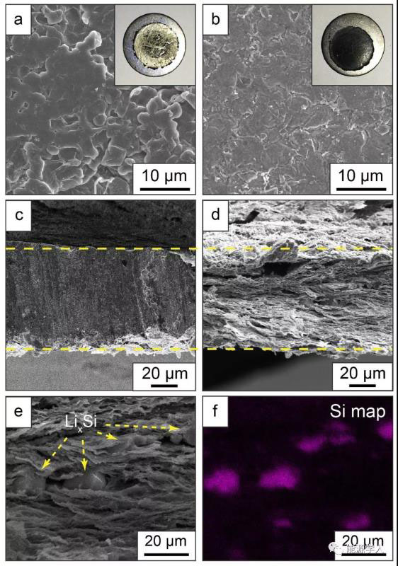 將嵌入層間的Si納米顆粒作為金屬Li沉積的成核種子的策略成功避免了Li優(yōu)先沉積在rGO表面的事實。隨著石墨烯層間Si納米粒子的存在,Li首先與Si形成合金,隨后再出現(xiàn)鋰金屬的沉積?;谶@樣的工作機制,通過圖3的SEM圖像可以看出,使用Si修飾之后的SirGO能夠使金屬Li優(yōu)先沉積在骨架內部,相反未修飾的rGO的表面出現(xiàn)大部分Li,由此構成的Li-SirGO復合電極也呈現(xiàn)出超致密的沉積行為。同時將Li-SirGO的Li剝離后(截止電壓為0.4V),顯示出均勻分布的LixSi的合金顆粒。