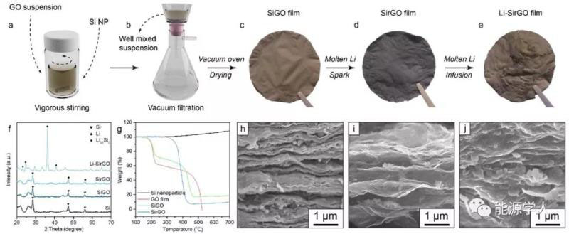 圖2. Li-rGO復合電極的制備與表征。(a-e)依次通過真空過濾制備SirGO和將熔融Li注入構建Li-SirGO復合負極;(f)XRD圖譜;(g)熱重分析(TGA)結果;(h-j)SiGO(h)、SirGO(i)和Li-SirGO的SEM圖像。