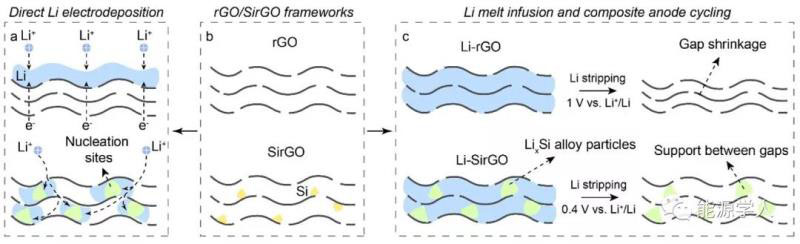 圖1. SirGO與傳統(tǒng)rGO的Li沉積行為的對比示意圖。(a)Li優(yōu)先沉積在SirGO內部。反之,Li優(yōu)先沉積rGO頂部;(b)rGO和SirGO原理圖;(c)通過控制截止電壓(0.4V),保證復合電極在循環(huán)過程中的LixSi顆粒不變,從而達到電極厚度無變化。