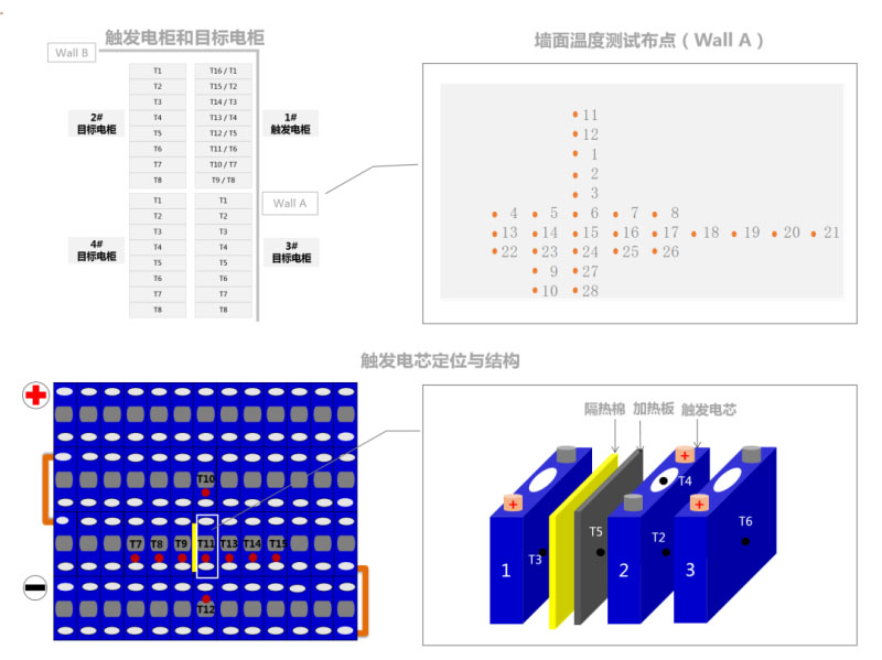以電柜層級測試為例,寧德時代風(fēng)冷和水冷產(chǎn)品均表現(xiàn)良好:在無消防系統(tǒng)的條件下,測試過程中電柜只會冒煙,并無火焰、飛濺物或氣體爆炸;電芯間也無熱擴散,其他電箱未受影響,觸發(fā)電柜、目標電柜與墻面均無損害;目標電柜表面最高溫、墻面溫度及相對溫升符合NFPA 220與NFPA 855要求。