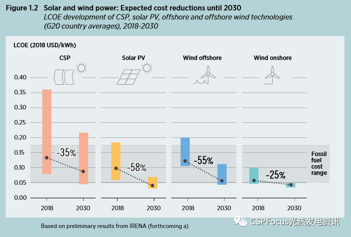 到2030年,G20國家光熱電站成本將從2018年的平均13.2美分/kWh降至8.6美分/kWh。CSP成本范圍也將從7.7美分/kWh-35.7美分/kWh縮小至4.4美分/kWh-21.4美分/kWh。