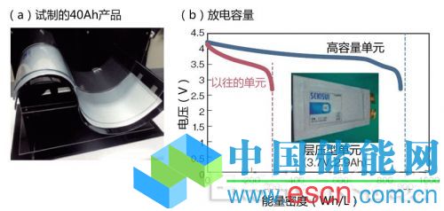 積水化學(xué)打算涉足的鋰離子充電電池是容量約為目前3倍的層壓型單元(圖1)注1)。該公司在新聞發(fā)布會(huì)上展示了容量約為40Ah的大型層壓型單元。能量密度方面,以電壓為3.7V,容量為2.9Ah的層壓型單元為例,單位體積的能量密度達(dá)到900Wh/L,單位重量達(dá)到340Wh/kg。
