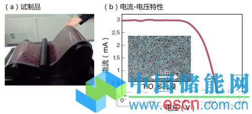 以前,在基板上涂布含TiO2的膏狀物的電池需要在500℃左右的高溫下進(jìn)行燒結(jié),由于耐熱性的問題,此前難以在通用薄膜上實(shí)現(xiàn)色素增感電池。
