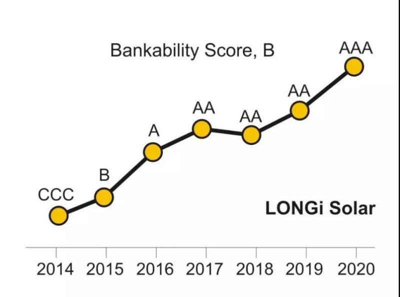 在最新發(fā)布2020年Q1 PV ModuleTech可融資性評級報告中,隆基成為首個也是唯一一個獲得AAA評級的組件供應(yīng)企業(yè),創(chuàng)下目前該評級報告中所統(tǒng)計最高水平,也同時是全球光伏組件供應(yīng)商可達到的最高級別。技術(shù)領(lǐng)先讓隆基股份獲得了高速的成長和發(fā)展,成長為了全球最大的單晶光伏產(chǎn)品制造商,在全球光伏產(chǎn)業(yè)中取得了領(lǐng)先地位。