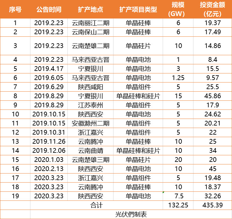 正是在這雄厚“財力”的加持下,從2019年初,隆基拉開了其加速擴產(chǎn)的大幕。據(jù)不完全統(tǒng)計,從2019年至今,隆基共計宣布了19項擴產(chǎn)信息,規(guī)模132GW,投資金額共計435億元。