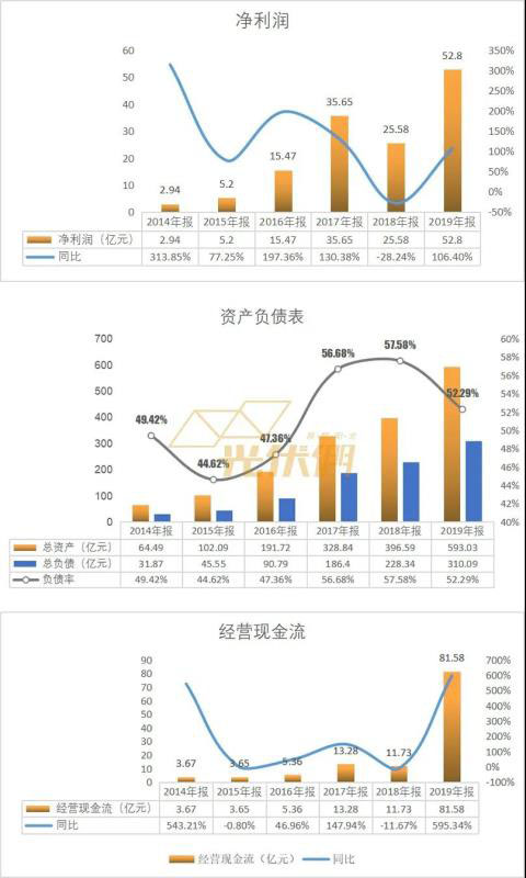 羅馬并非一日建成,隆基用6年的時間,證明了單晶路線的正確性,同時也見證了整個光伏產(chǎn)業(yè)發(fā)生的巨大變化:多晶陣營苦苦維系在被淘汰的邊緣、PERC技術(shù)獨擋潮流……在這六年里,隆基將營收從2014年的36.8億元提高至2019年的329億,幾乎翻了10倍;凈利潤方面,也一直是光伏企業(yè)的佼佼者,2019年更是史無前例的達到52.8億元;隨著應(yīng)收賬款的優(yōu)化,2019年企業(yè)經(jīng)營現(xiàn)金流暴增近6倍。