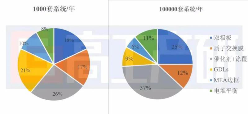 美國DOE以80KWnet為模型,基于2017年可能的技術(shù)能力所預測的不同產(chǎn)量下電堆各部件的成本組成(單位:%)