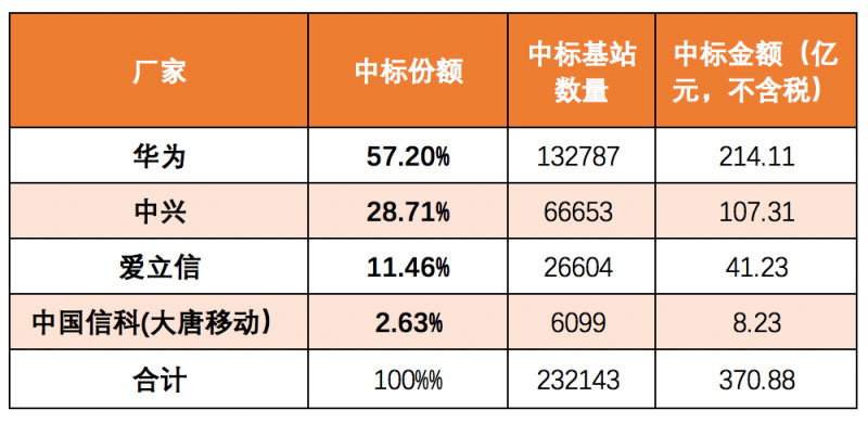 從三大運(yùn)營商5G無線網(wǎng)的集采結(jié)果來看,華為、中興、愛立信和大唐是最后的贏家,瓜分了所有市場份額。
