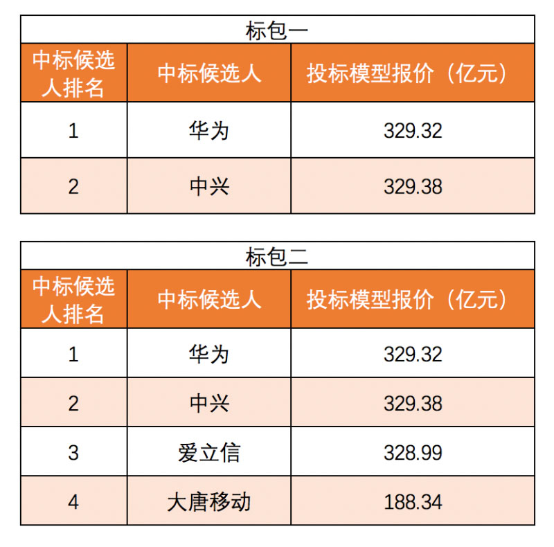 從結(jié)果來看:標(biāo)包一的第一、第二中標(biāo)候選人分別為華為、中興;標(biāo)包二的第一、第二、第三、第四中標(biāo)候選人分別為華為、中興、愛立信、大唐移動(dòng)。此前在中國移動(dòng)5G主設(shè)備集采中失利的諾基亞,在本次電聯(lián)集采中再次落空。