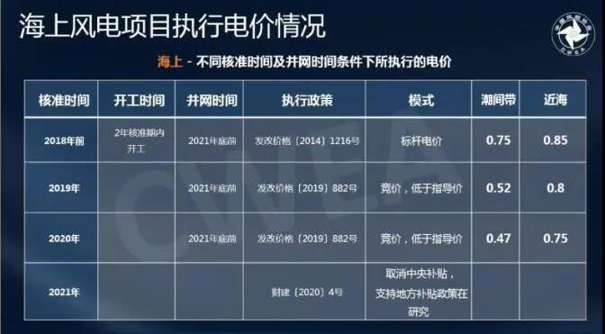 《國家發(fā)展改革委關(guān)于完善風(fēng)電上網(wǎng)電價(jià)政策的通知》:對2018年底前已核準(zhǔn)的海上風(fēng)電項(xiàng)目,如在2021年底前全部機(jī)組完成并網(wǎng)的,執(zhí)行核準(zhǔn)時(shí)的上網(wǎng)電價(jià);2022年及以后全部機(jī)組完成并網(wǎng)的,執(zhí)行并網(wǎng)年份的指導(dǎo)價(jià)。