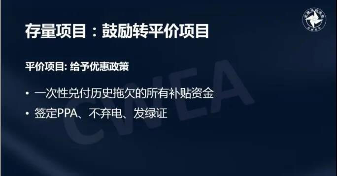 在存量項(xiàng)目的補(bǔ)貼上,可再生能源補(bǔ)貼政策鼓勵(lì)存量項(xiàng)目放棄補(bǔ)貼,轉(zhuǎn)為平價(jià)項(xiàng)目,并且給予優(yōu)惠政策:一次性兌付歷史拖欠的所有補(bǔ)貼資金,同時(shí)簽定PPA、保證不棄電、發(fā)放綠證。
