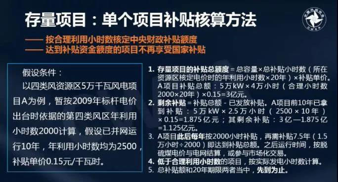 對于存量單個(gè)項(xiàng)目的補(bǔ)貼核算方法的計(jì)算上,秦海巖秘書長做了詳細(xì)的解讀,特別強(qiáng)調(diào)了補(bǔ)貼是按照合理利用小時(shí)數(shù)來進(jìn)行核定。需要注意的是,國家尚未出臺計(jì)算補(bǔ)貼時(shí)具體的合理利用小時(shí)數(shù),據(jù)秦海巖秘書長測算:“即使在四類區(qū),合理利用小時(shí)數(shù)最差也有2000小時(shí)。”
