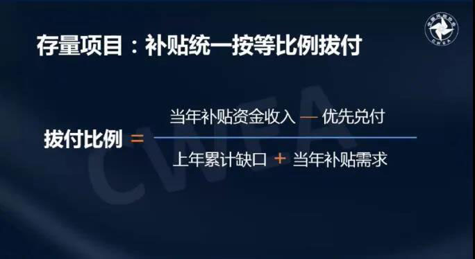 同時(shí),陸上風(fēng)電存量項(xiàng)目的補(bǔ)貼需要統(tǒng)一按照等比例進(jìn)行撥付。撥付比例是當(dāng)前補(bǔ)貼資金收入減去優(yōu)先兌付的值除以上年累計(jì)缺口加上當(dāng)年補(bǔ)貼需求的值。