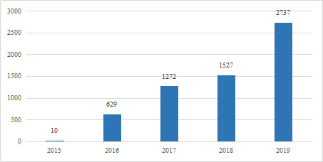 圖1 中國2015-2019年燃料電池汽車銷量一覽