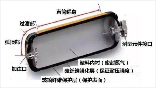 國際主流技術(shù)以鋁合金/塑料作為氫瓶內(nèi)膽用于保溫,外層則用3公分左右厚度的碳纖維進(jìn)行包覆,提升氫瓶的結(jié)構(gòu)強(qiáng)度并盡可能減輕整體質(zhì)量。氫瓶閥門處利用細(xì)長的管道將幾組氫瓶進(jìn)行串聯(lián),并加裝溫度傳感器等監(jiān)控設(shè)備。安全性方面,當(dāng)溫度傳感器感應(yīng)到外界溫度遠(yuǎn)高于正常溫度時(shí)(一般超過100℃時(shí)),會(huì)自動(dòng)打開閥門快速釋放瓶內(nèi)所有氣體。