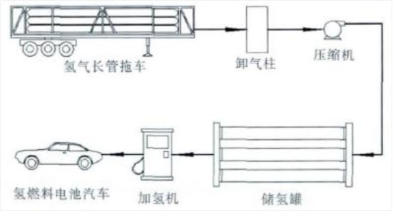 氫氣長管拖車將氫氣運(yùn)輸至加氫站后,裝有氫氣的半掛車與牽引車分離并和卸氣柱相連接。隨后氫氣進(jìn)入壓縮機(jī)內(nèi)被壓縮,并先后輸送至高壓、中壓、低壓儲氫罐中分級儲存。需要對汽車進(jìn)行加注服務(wù)時(shí),加氫機(jī)可以先后從氫氣長管拖車、低壓儲氫罐、中壓儲氫罐、高壓儲氫罐中按順序取氣進(jìn)行加注。