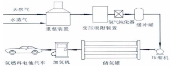 脫硫后的天然氣和水蒸氣在高溫、催化劑的條件下在重整裝置中反應(yīng)生成氫氣、一氧化碳以及二氧化碳等。隨后通過變壓吸附裝置(PSA)將氫氣分離出來。分離出來的氫氣進(jìn)一步在氫氣純化器中純化。本流程中純化的目的是進(jìn)一步除去一氧化碳、二氧化碳、甲烷等雜質(zhì),以達(dá)到燃料電池汽車對氫氣質(zhì)量的要求(氫氣體積分?jǐn)?shù)>99.9999%)。