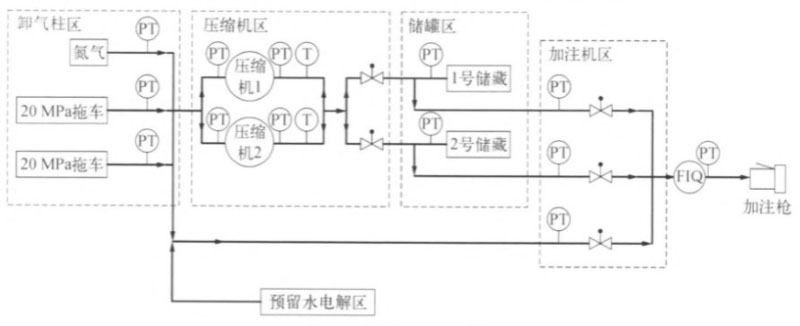 站內(nèi)電解水制氫加氫站工藝流程:水在電解裝置的陰陽兩極分別產(chǎn)生氫氣和氧氣。氫氣進(jìn)入氣水分離器進(jìn)行干燥,干燥后在氫氣純化器中純化。本流程中純化的目的是除去氧氣及雜質(zhì),以達(dá)到燃料電池汽車對氫氣質(zhì)量的要求(氫氣體積分?jǐn)?shù)>99.999 9%)。純化后的氫氣通過緩沖罐后進(jìn)入壓縮機(jī)內(nèi)被壓縮,并先后輸送至高壓、中壓、低壓儲氫罐中分級儲存。需要對汽車進(jìn)行加注服務(wù)時(shí),加氫機(jī)可以先后從低壓儲氫罐、中壓儲氫罐、高壓儲氫罐中按順序取氣進(jìn)行加注。