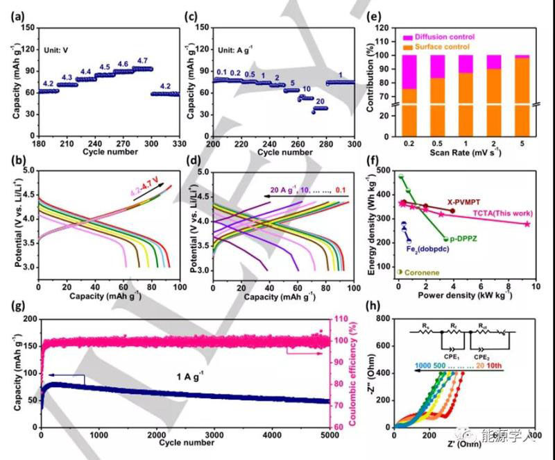 圖3.(a)分別在4.2至4.7 V的不同截止電壓下TCTA正極的循環(huán)性能和(b)相應(yīng)充電/放電曲線。(c)不同電流密度下TCTA正極的倍率性能和(d)相應(yīng)充電/放電曲線。(e)在不同掃速下擴(kuò)散控制和表面控制的容量貢獻(xiàn)率,(f)文獻(xiàn)中報(bào)道的TCTA和其他有機(jī)正極材料的性能比較,(g)TCTA正極在1 A g-1下的長期循環(huán)性能,(h)在500 mA g-1時(shí)不同周期的TCTA正極的EIS譜(內(nèi)部:等效擬合電路)。