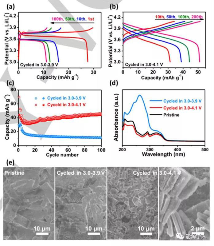 圖2. TCTA正極在不同電壓窗口的恒電流充/放電曲線(a)3.0-3.9 V,(b)3.0-4.1 V(c)相應(yīng)的200 mA g-1電流密度下的循環(huán)穩(wěn)定性,(d)不同對比樣品UV-vis光譜和(e)非原位SEM圖像。