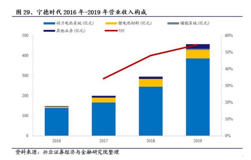 公司為全球鋰電池龍頭企業(yè),尤其在動力電池行業(yè),2019年市占率高達(dá)52%,同比提升11%。2019年公司實(shí)現(xiàn)營業(yè)收入458億元,同比增長54.6%,其中動力電池系統(tǒng)實(shí)現(xiàn)營收386億元,占比84.3%,同比增加57%。鋰電材料實(shí)現(xiàn)營收43.1億元,占比9.4%,同比增加11.5%,儲能系統(tǒng)實(shí)現(xiàn)營收6.1億元,占比1.3%,同比增速221.94%。