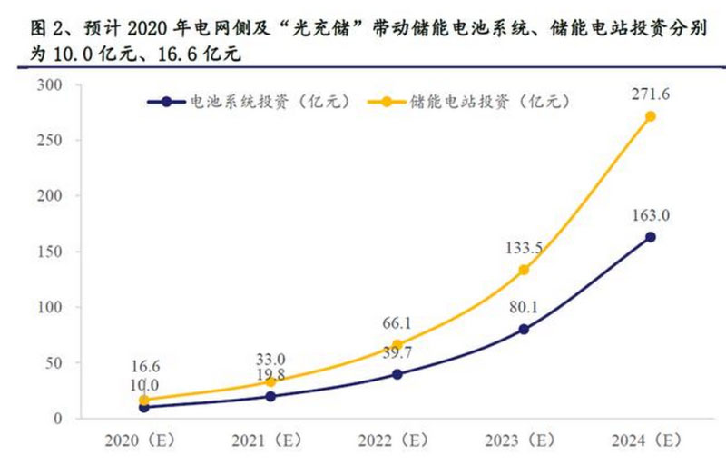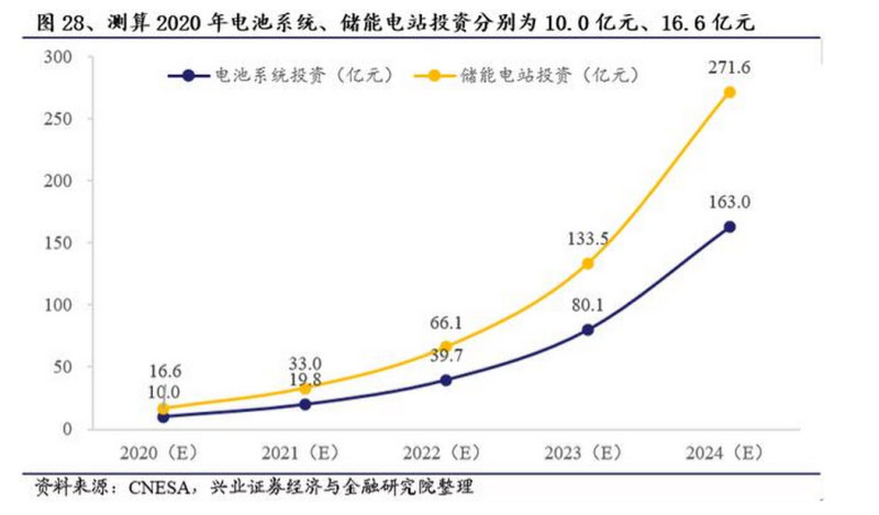 儲能投資測算:基于2020年初的中標(biāo)價情況,儲能電池系統(tǒng)約1.2元/kWh,儲能電站整體投資約2元/kWh,測算2020年電池系統(tǒng)、儲能電站投資分別約10.0億元、16.6億元,2024年上述投資分別約163.0億元、271.6億元。