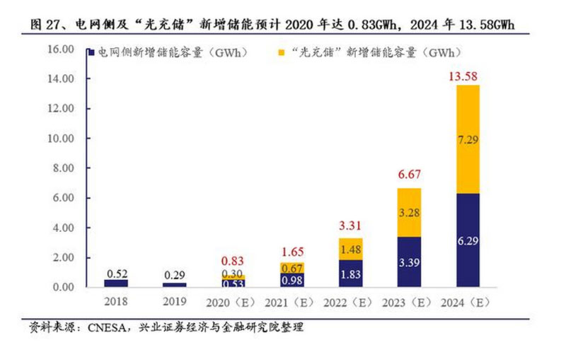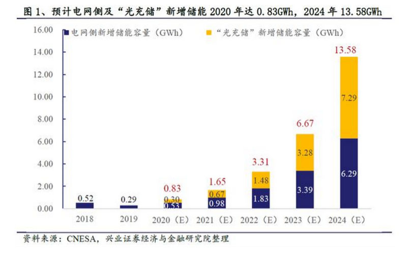 儲能容量測算:在不考慮其他類型電化學(xué)儲能的貢獻(xiàn)情況下,僅考慮電網(wǎng)側(cè)及“光充儲”儲能二者之和,預(yù)計(jì)2020年新增0.83GWh,2024年新增13.58GWh。
