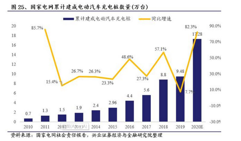 4月14日,國家電網(wǎng)召開2020年全面建設(shè)新能源汽車充電設(shè)施項(xiàng)目集中聯(lián)動開工視頻會議,計(jì)劃安排充電樁建設(shè)投資27億元,新增充電樁7.8萬個,除公用和專用充電樁2.5萬個外,建設(shè)居住區(qū)充電樁5.3萬個,全面推廣居民區(qū)智能有序充電。在“新基建”加碼的背景下,國網(wǎng)充電樁建設(shè)重回快車道,預(yù)計(jì)至2020年底國網(wǎng)累計(jì)建成充電樁數(shù)量17.28萬臺,同比增速82.3%。