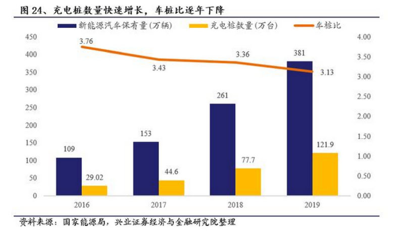 我國新能源汽車及充電樁保有量迅速增長,截至2019年底,充電樁數(shù)量已達(dá)122萬臺,車樁比下降至3.13,鑒于未來新能源汽車數(shù)量持續(xù)增加以及車樁比進(jìn)一步下降的趨勢,充電樁數(shù)量勢必會大幅增長,據(jù)發(fā)改委制定的發(fā)展目標(biāo),未來中國的總體充電樁保有量將達(dá)到480萬個,以滿足500萬輛電動汽車的出行要求。
