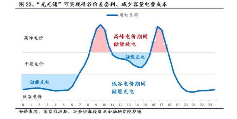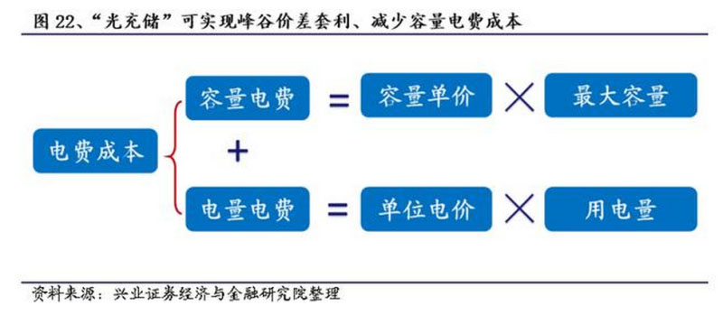 2)“光充儲”一體化配套儲能前景可觀。兩種盈利模式:峰谷價差套利+減少容量電費(fèi)成本。我國對于大容量工商業(yè)用電實(shí)行“容量電費(fèi)+電量電費(fèi)”模式,通過配置儲能,一方面通過儲能在低谷電價時充電,高峰電價時放電可減少電量電費(fèi),另一方面由于用電負(fù)荷的高峰用電時段一般時間很短,通過配置削減用電負(fù)荷的“高峰段”,可以減少容量電費(fèi)成本。