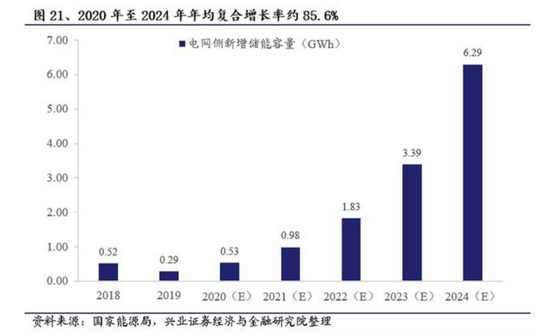 據(jù)中關(guān)村儲能協(xié)會CNESA統(tǒng)計(jì),2018年、2019年的電網(wǎng)側(cè)新增儲能功率分別為207MW、114MW,我們按平均儲能時長2.5小時估算其容量,進(jìn)一步測算2020年2024年的中性預(yù)測下儲能的年均復(fù)合增長率,約為85.6%。
