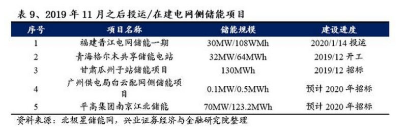 盡管2019年國家發(fā)改委明確電網(wǎng)側(cè)儲能不能計(jì)入輸配電價成本,導(dǎo)致電網(wǎng)側(cè)儲能發(fā)展態(tài)勢遭遇急剎車,但我們依然認(rèn)為電網(wǎng)側(cè)儲能具有旺盛的生命力。2019年下半年以后仍有若干電網(wǎng)側(cè)儲能投運(yùn)或繼續(xù)推進(jìn)。比如青海開創(chuàng)性地采用了共享儲能項(xiàng)目模式,裝機(jī)規(guī)模32MW/64MWh,已于2019年12月開建,其由上海電氣作為獨(dú)立主體建設(shè),擬完全依靠市場化運(yùn)營,無需通過輸配電價疏導(dǎo)。