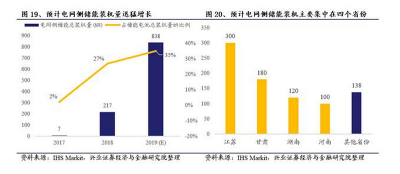 近兩年來,隨著各地電網(wǎng)側(cè)儲能項(xiàng)目的紛紛落地并網(wǎng),電網(wǎng)側(cè)儲能規(guī)模在2018年曾實(shí)現(xiàn)爆發(fā)性增長,根據(jù)CNESA儲能項(xiàng)目數(shù)據(jù)庫的統(tǒng)計(jì),2018年新增電網(wǎng)側(cè)電化學(xué)儲能規(guī)模206.8MW,占2018年全國新增投運(yùn)電化學(xué)儲能規(guī)模的36%。IHS Markit曾在2019年6月預(yù)計(jì)至2019年底有望達(dá)到838MW,占儲能電池總裝機(jī)的比例提升至35%,居各類儲能應(yīng)用之首,這些項(xiàng)目將主要集中在江蘇、湖南、河南和甘肅四個省份,其他省份裝機(jī)總量雖小但普遍存在電網(wǎng)側(cè)儲能大需求,電網(wǎng)側(cè)儲能未來裝機(jī)潛力巨大。