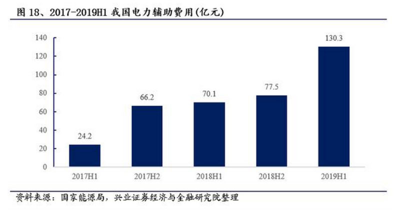 2017年至今,我國電力輔助服務(wù)費(fèi)用快速增長,2019年上半年輔助服務(wù)補(bǔ)償費(fèi)用總額為130.31億元,比2018年同期增長85.9%,補(bǔ)償費(fèi)用占上網(wǎng)電費(fèi)總額的1.47%,比2018年同期增長0.6%,電力輔助服務(wù)市場潛力巨大。未來電網(wǎng)側(cè)儲能不僅可在輔助服務(wù)市場中分一杯羹,利好政策也將擴(kuò)大其對補(bǔ)償費(fèi)用的占有比例。