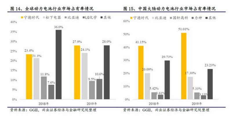 動力電池領(lǐng)域,寧德時代在全球和中國大陸均處于龍頭地位,國內(nèi)更加顯著。市場占有率在全球和中國大陸市場均保持第一,且有不同程度的上升,截至2019年全球市場占有率達(dá)27.9%,同比提升4.5%,國內(nèi)市場占有率高達(dá)51.01%,同比提升9.86%。