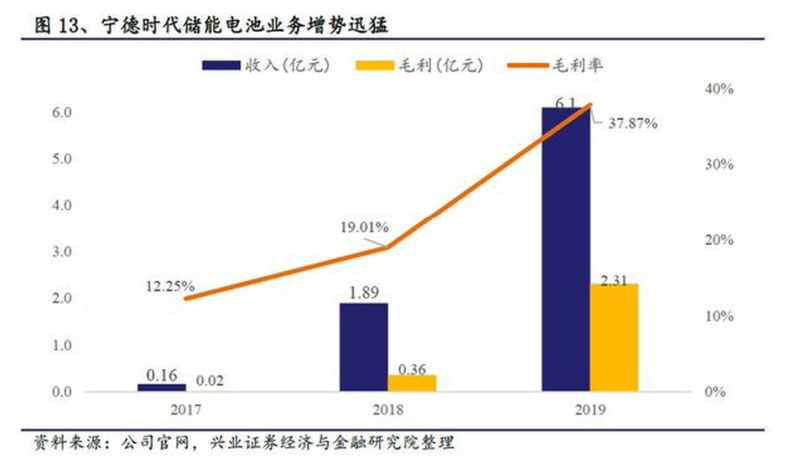 公司18-19年儲能業(yè)務(wù)均實(shí)現(xiàn)跨越式發(fā)展,2018年儲能營收1.89億,同比增速850%;2019年儲能營收6.1億元,同比增速221.94%。毛利方面,公司儲能2019年實(shí)現(xiàn)毛利2.31億元;毛利率持續(xù)增長,至2019年儲能業(yè)務(wù)毛利率已明顯高于公司其他業(yè)務(wù)。