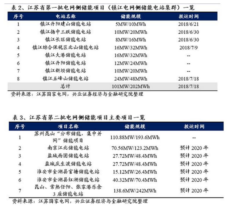 江蘇國家電網(wǎng)自2018年至今已規(guī)劃兩批電網(wǎng)側(cè)儲能項(xiàng)目,第一批為鎮(zhèn)江電網(wǎng)側(cè)儲能電站集群,在鎮(zhèn)江的3個地區(qū)建設(shè)8個儲能電站,總規(guī)模為101MW/202MWh,已于2018年7月18日建成投運(yùn);第二批電網(wǎng)側(cè)儲能項(xiàng)目計(jì)劃在南京、蘇州等5個地區(qū)建設(shè)10個儲能電站,總?cè)萘窟_(dá)752.6MW,預(yù)計(jì)于2020年建成投運(yùn),其中南京江北儲能電站已于2019年3月6日開工建設(shè),該儲能電站最大充放電功率可達(dá)13.088萬千瓦,總存儲容量26.86萬千瓦時,是目前國內(nèi)容量最大、功率最高的電化學(xué)儲能電站,也是我國首個梯次利用的電網(wǎng)側(cè)儲能電站。