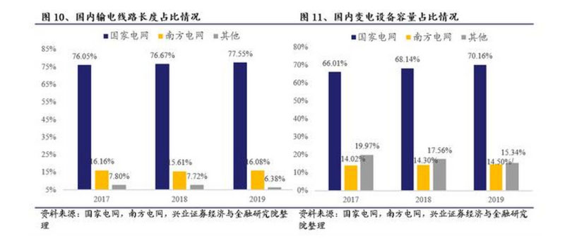 目前國網(wǎng)已在電網(wǎng)側(cè)占據(jù)壟斷地位。2019年國網(wǎng)輸電線路長度占國內(nèi)總長度的77.55%,變電設(shè)備容量占國內(nèi)總?cè)萘康?0.16%,占有率遠(yuǎn)遠(yuǎn)超過第二名南方電網(wǎng),行業(yè)龍頭地位顯著。電網(wǎng)側(cè)行業(yè)集中度極高且有繼續(xù)提高的趨勢,國網(wǎng)的壟斷地位很難動搖。