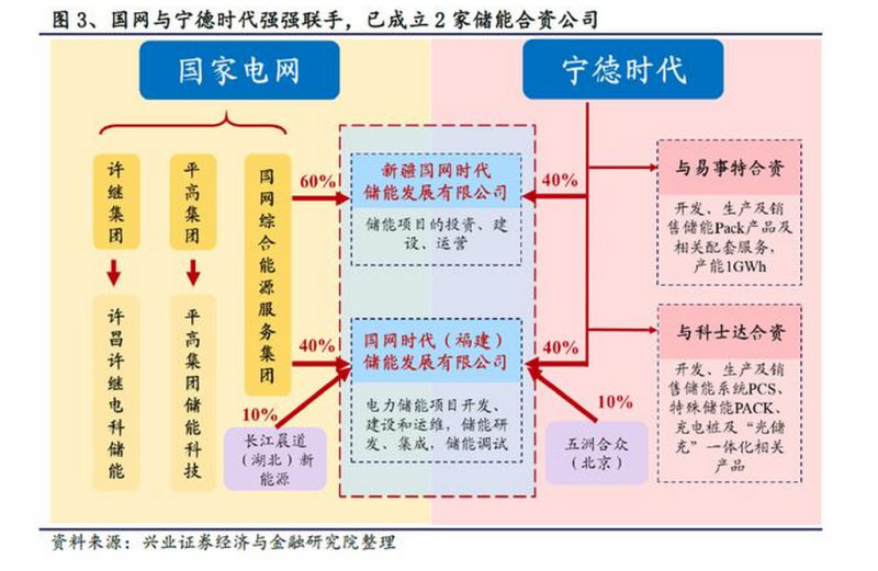 2020年1月以來,國家電網(wǎng)旗下國網(wǎng)綜合能源服務(wù)集團(tuán)有限公司與寧德時代接連在新疆和福建成立合資公司。1月7日成立的新疆國網(wǎng)時代儲能發(fā)展有限公司是兩家公司成立的首個儲能合資公司,注冊資本3000萬元,其中國網(wǎng)綜能持股60%,寧德時代持股40%,公司主營儲能項(xiàng)目的投資、建設(shè)和運(yùn)營;4月3日,國網(wǎng)與寧德時代再次聯(lián)手,國網(wǎng)時代(福建)儲能發(fā)展有限公司宣告成立,公司注冊資本4億元,寧德時代和國網(wǎng)綜能各持股40%,主營業(yè)務(wù)包括電力儲能項(xiàng)目開發(fā)、建設(shè)和運(yùn)維、技術(shù)服務(wù)等,為綜合能源服務(wù)提供儲能專業(yè)解決方案。