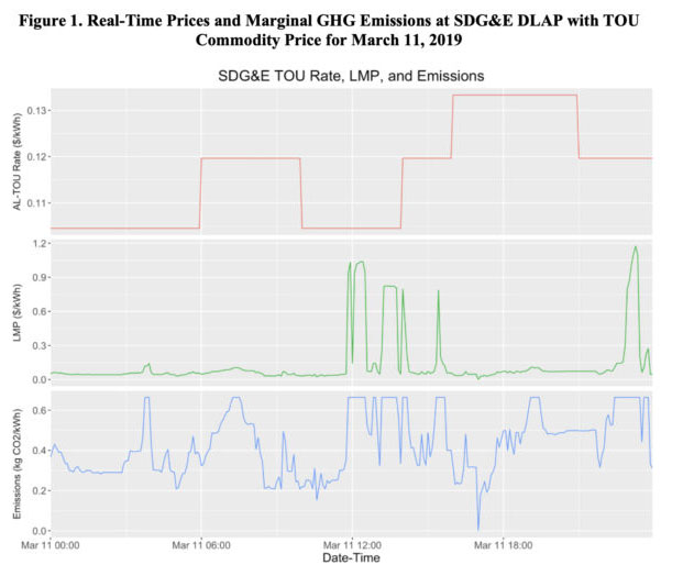 Murtishaw以圣迭戈天然氣和電力公司(SDG&E)在2019年3月11日的電力系統(tǒng)實(shí)時(shí)電價(jià)和溫室氣體排放量為例。他指出,下圖中第三條曲線顯示的溫室氣體排放高峰確實(shí)與第二條曲線的批發(fā)價(jià)格的多個(gè)高峰相匹配。這表明通過(guò)在電力需求峰值期間采用減少能耗的實(shí)時(shí)電價(jià)也會(huì)減少溫室氣體排放量。