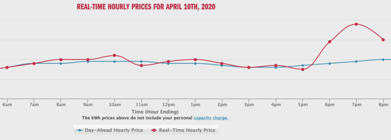 作為比較,在下圖中展示了南加州愛(ài)迪生公司(SCE)今年4月10日的實(shí)時(shí)電價(jià)。其住宅電表可以記錄每小時(shí)使用情況。圖中的藍(lán)線是使用費(fèi)率電價(jià),紅線是實(shí)時(shí)電價(jià)。