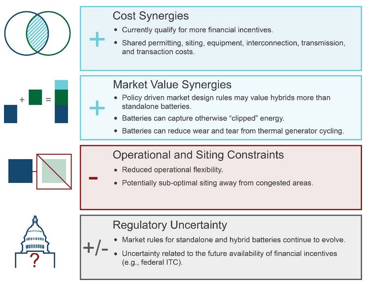 將可再生能源發(fā)電設(shè)施和電池儲能系統(tǒng)共址部署可以節(jié)省共享設(shè)備和互連成本,并可以充分利用有利于太陽能發(fā)電設(shè)施和電池儲能系統(tǒng)配套部署的美國聯(lián)邦稅收抵免政策。相對于獨立部署的發(fā)電設(shè)施,電力系統(tǒng)運營商和購買者可能更喜歡應(yīng)用混合部署的發(fā)電設(shè)施,因為它們具有更大的調(diào)度靈活性。但是將發(fā)電設(shè)施和電池儲能系統(tǒng)共址部署,可能并不總是一個最佳的解決方案。