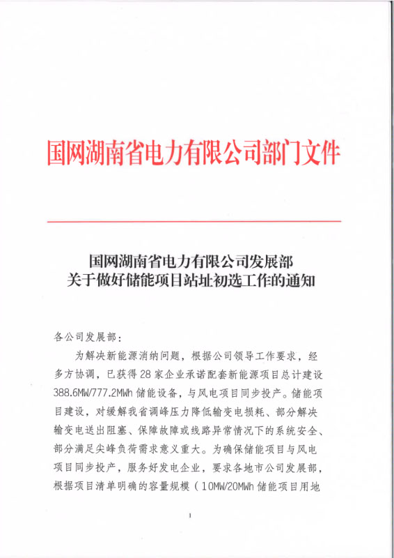 “儲(chǔ)能100人”獲悉,近日,國(guó)網(wǎng)湖南省電力有限公司發(fā)展部下發(fā)《關(guān)于做好儲(chǔ)能項(xiàng)目站址初選工作的通知》。