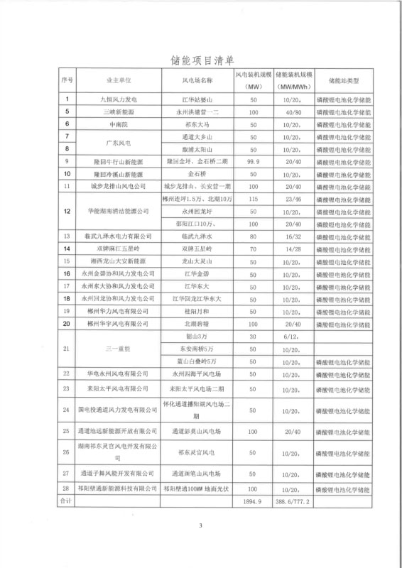 根據(jù)文件,湖南省境內(nèi)28家企業(yè)承諾配套風(fēng)電+儲(chǔ)能項(xiàng)目共計(jì)388.6MW/777.2MWh,與風(fēng)電項(xiàng)目同步投產(chǎn),配置儲(chǔ)能比例為20%,時(shí)長(zhǎng)為2小時(shí)。