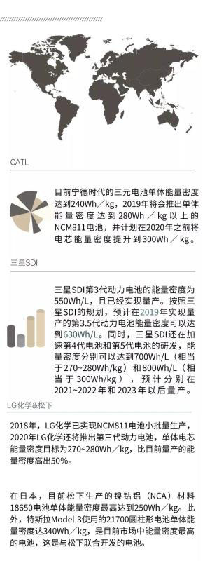總體來看,各家企業(yè)在提高能量密度的路上,不約而同地把目光瞄向了三元體系,高鎳化成為共識。在這一過程中,鎳鈷錳(NCM)或者NCA成為提升能量密度的法寶,電池類型也從NCM523發(fā)展到NCM622,如今NCM811電池也已實現(xiàn)量產(chǎn)。不過,盡管各大企業(yè)對高比能量的發(fā)展路線有了一致認識,但在這一競賽中暫時也分出了高低。目前,松下憑借21700電池的高能量密度領先于其他企業(yè),三星SDI落后于其他對手,處于墊底位置。